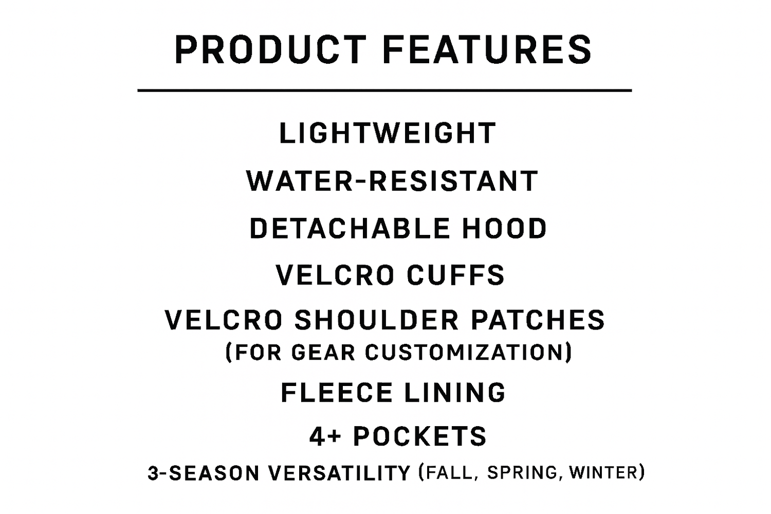 SaltGuard Pro- For anglers By anglers. Built to tackle the demands of saltwater environments, this lightweight, water-resistant jacket keeps you dry and comfortable during every adventure. Featuring a detachable hood for versatility, Velcro cuffs for a secure fit, and Velcro shoulder patches for gear customization, it adapts seamlessly to any condition. The fleece lining provides essential warmth, while 4+ strategically placed pockets offer ample storage for all your tools and essentials. Ideal for fall, spring, and winter, the SaltGuard Pro is your go-to jacket for performance, comfort, and style on the water.